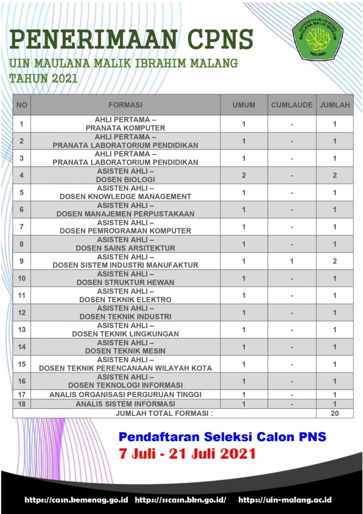 PENGUMUMAN NOMOR :2412/Un.3/HK.00.7/07/2021 TENTANG PELAKSANAAN SELEKSI CALON PEGAWAI NEGERI SIPIL DI UNIVERSITAS ISLAM NEGERI MAULANA MALIK IBRAHIM MALANG TAHUN 2021 Berdasarkan Pengumuman dari Sekretariat Jenderal Kementerian Agama Republik Indonesia Nomor: P-3023/SJ/B.II.2/KP.00.2/07/2021 Tanggal 06 Juli 2021 Tentang Pelaksanaan Seleksi Calon Peawai Negeri Sipil (CPNS) Kementerian Agama Republik Indonesia Tahun Anggaran 2021,